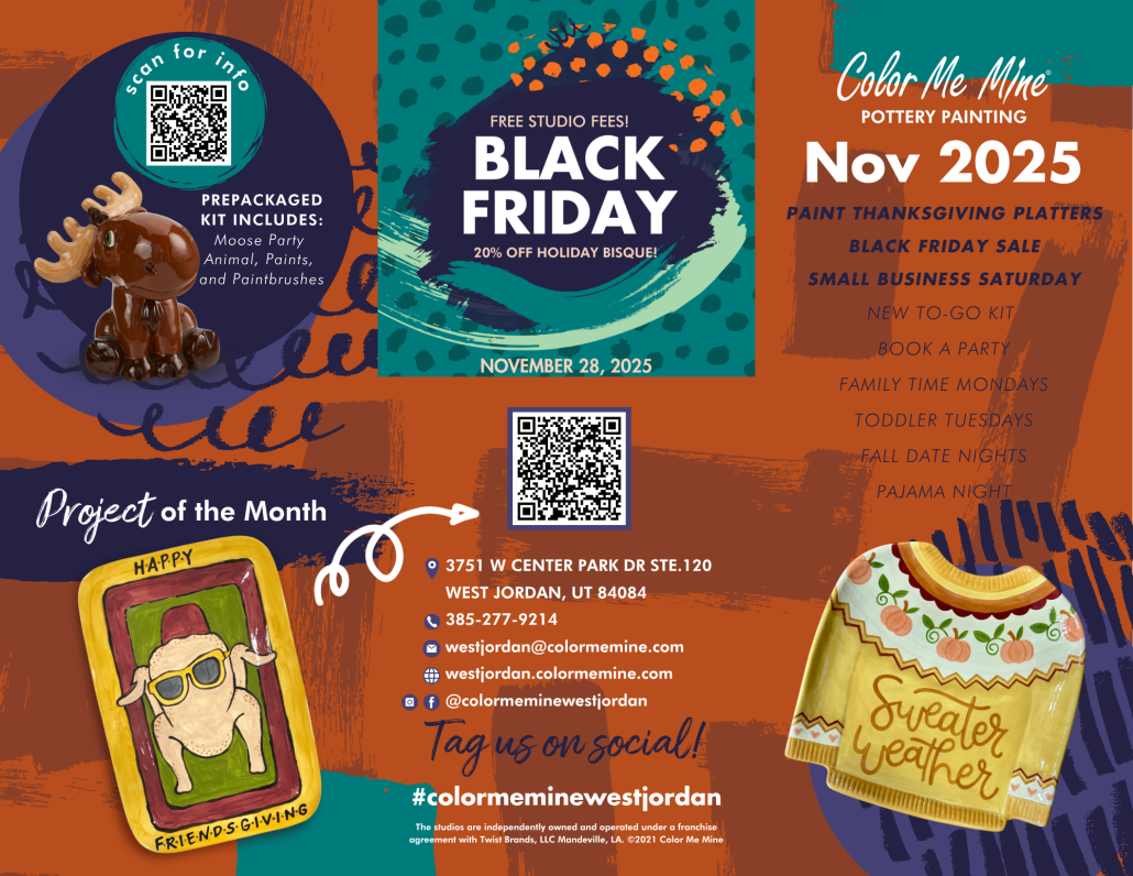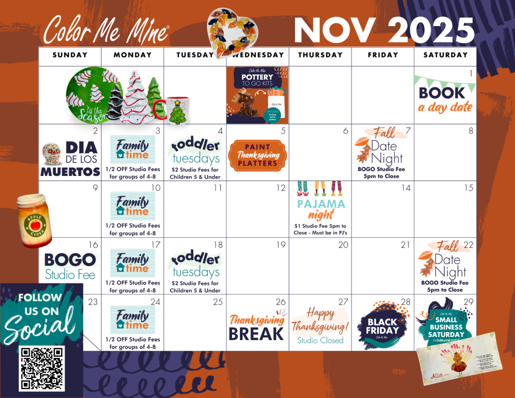 It's officially Cozy Season at Color Me Mine! November is the perfect time to slow down, put on your sweater, and get creative. Celebrate the season with a warm pajama night at the studio or plan a cozy fall date night for two. Whether you're painting personalized holiday gifts or something just for you, it's the perfect way to make lasting memories. Come on in and kick off the cozy season with a splash of color!🎨